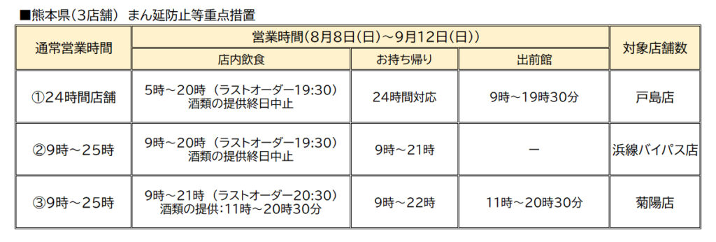 まん延防止等重点措置適用延長に伴う、熊本県からの店内飲食営業時間時短要請を受け、9月12日(日)まで、資さんうどん熊本県下3店舗(菊陽店・戸島店・浜線バイパス店)の営業時間を下記の通りとさせて頂きます。お客さまにおかれましては、ご迷惑・ご不便をおかけ致しますが、何卒、ご理解・ご了承の程、宜しくお願い致します。