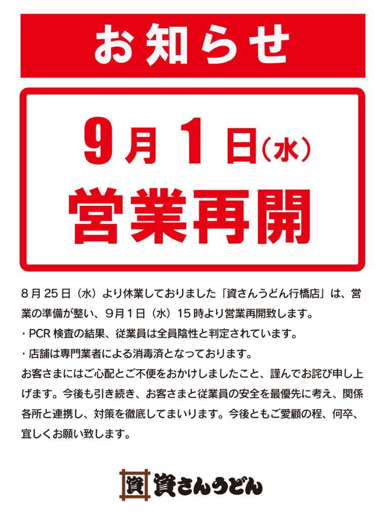 8/25(水)〜休業しておりました資さんうどん行橋店は、本日9/1(水)15時~営業を再開致します。従業員全員のPCR検査陰性の確認、専門業者による消毒・検査の完了を以って、営業を再開致します。お客さまにはご心配とご不便をおかけしましたこと、謹んでお詫び申し上げます。今後も引き続き、お客さまと従業員の安全を最優先に考え、関係各所と連携し、対策を徹底してまいります。今後ともご愛顧の程、何卒、宜しくお願い致します。