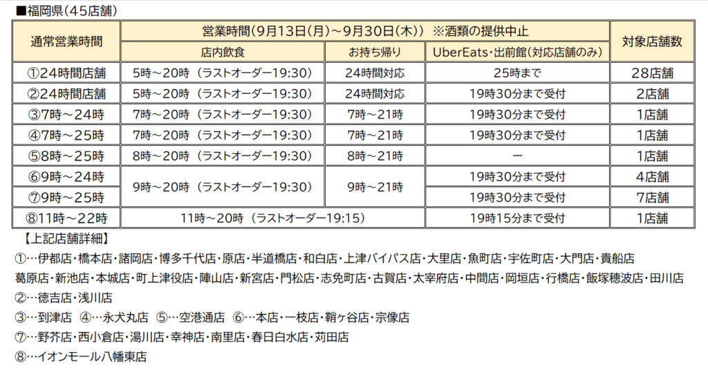 9/13(月)~9/30(木)福岡県下45店舗営業時間について