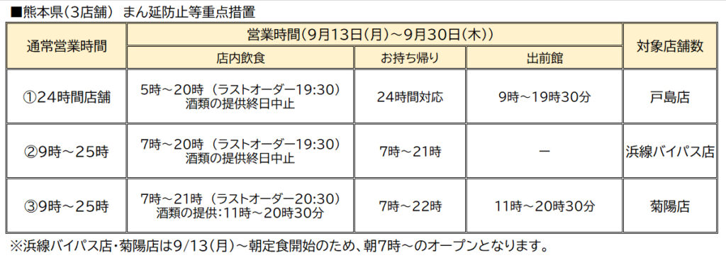 まん延防止等重点措置適用延長に伴う、熊本県からの店内飲食営業時間時短要請を受け、9/13(月)~9/30(木)の期間、資さんうどん熊本県下3店舗(菊陽店・戸島店・浜線バイパス店)の営業時間を下記の通りとさせて頂きます。お客さまにおかれましては、ご迷惑・ご不便をおかけ致しますが、何卒、ご理解・ご了承の程、宜しくお願い致します。