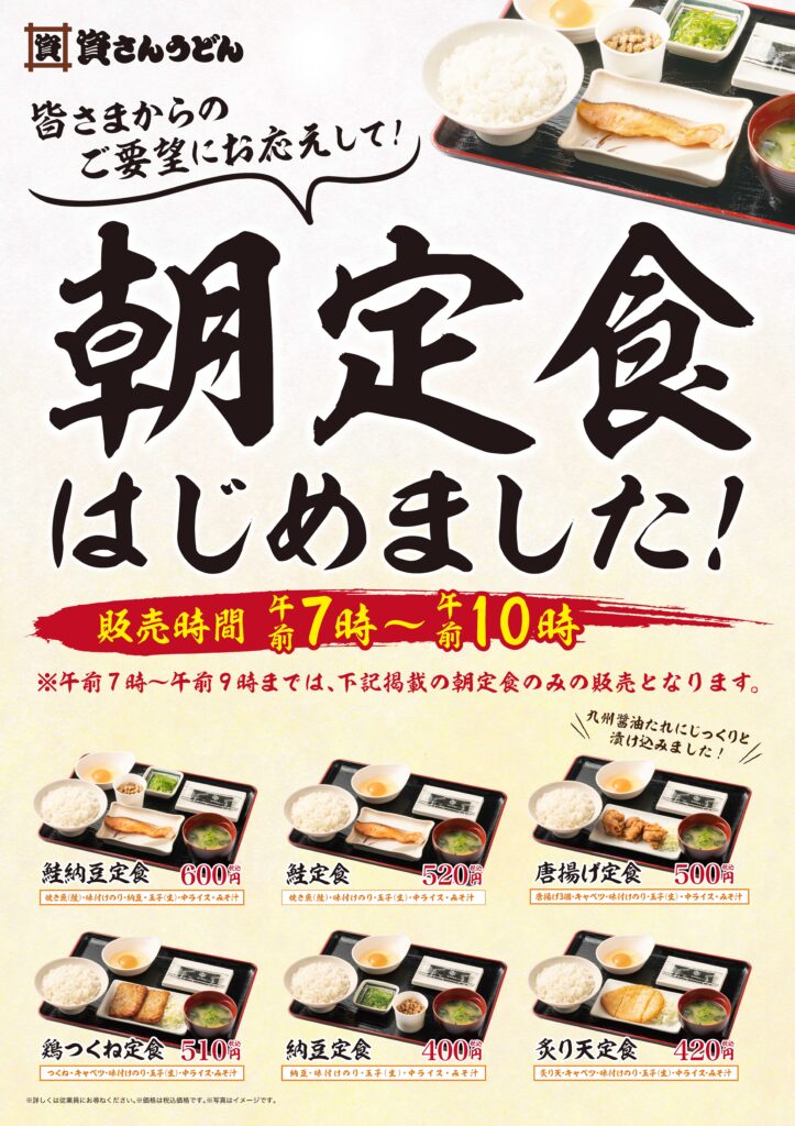 9/13(月)7時~資さんうどん4店舗朝定食はじめます!