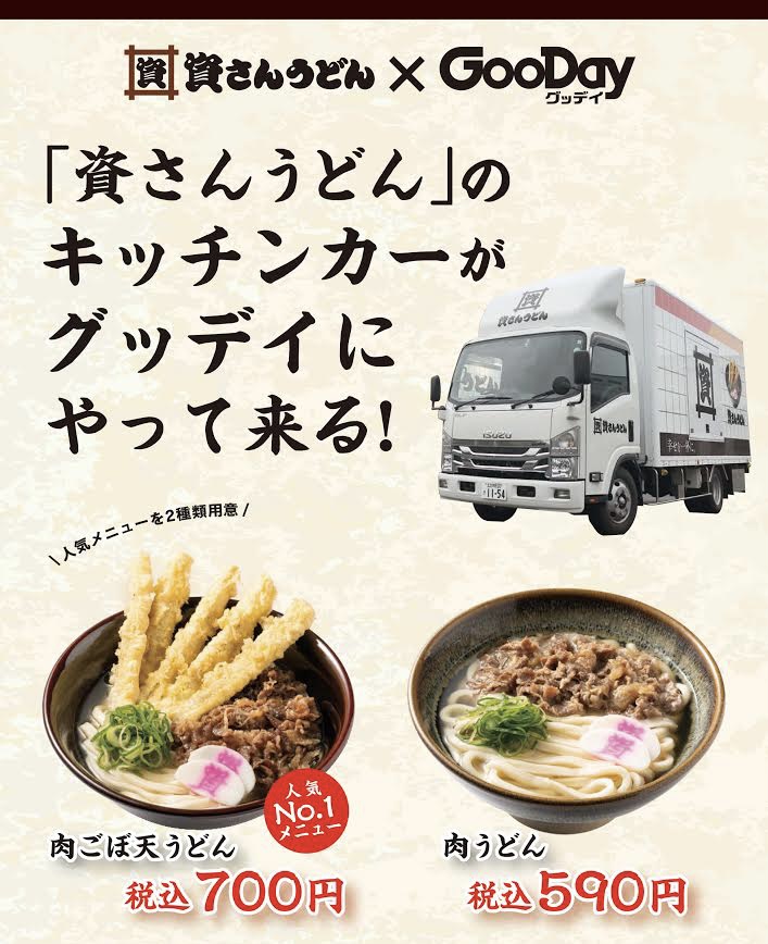 柳川の皆さまお待たせしました!資さんうどんキッチンカーが今週末11/20(土)・21(日)の2日間、グッデイ柳川店に登場します!柳川市には初上陸となります!各日11時~人気No.1メニュー「肉ごぼ天うどん」、「肉うどん」、名物「ぼた餅」等販売します!柳川の皆さま、今週末は、グッデイ柳川店へぜひ、ご来店ください!!