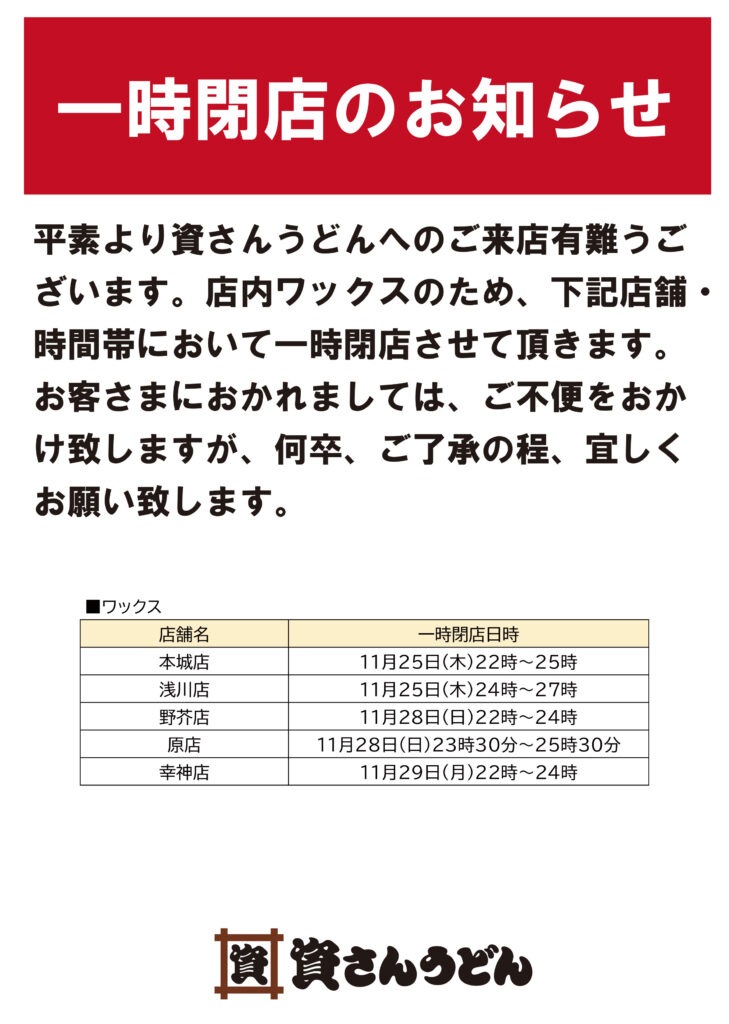 平素より資さんうどんへのご来店ありがとうございます。店内ワックスのため、下記店舗・日時において、一時閉店させて頂きます。お客さまにおかれましては、ご不便をおかけ致しますが、何卒、ご理解・ご了承の程、宜しくお願い致します。