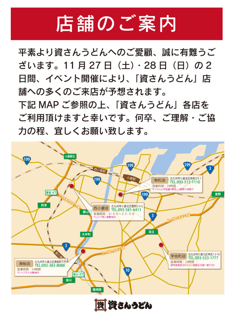 11/27(土)「あるあるcity」ならびに11/27(土)・28(日)「北九州ソレイユホール」でのイベント開催に伴い、資さんうどん 店舗へ多くのお客さまのご来店が予想されます。下記MAPにて小倉駅周辺店舗を記載しております。ご参照の上、ご利用頂けますと幸いです。何卒、ご理解・ご協力の程、宜しくお願い致します。