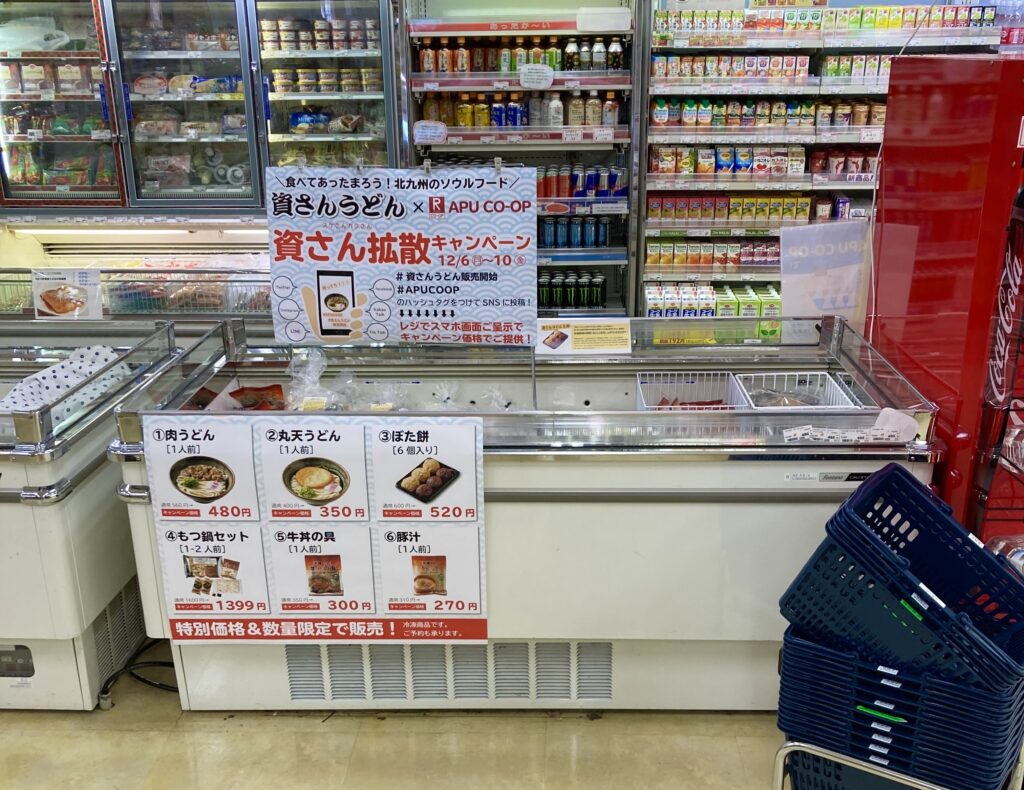 本日12/6(月)〜 大分県別府市の立命館アジア太平洋大学(APU)内生協にて、資さんうどん の各種商品販売開始しました!12/6〜10の期間は、お得に商品が購入出来る「資さん拡散キャンペーン」実施中です。肉うどん・丸天うどん・名物ぼた餅等販売中です!この機会にぜひ、お試しください!