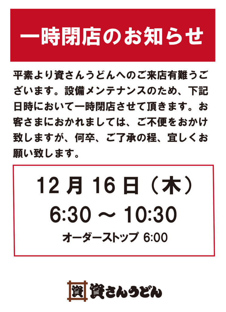 12/16(木)資さんうどん新池店にて設備メンテナンスによる一時閉店をさせて頂きます。午前6時のオーダーストップとさせて頂きます。お客さまにおかれましては、ご不便・ご迷惑をおかけしますが、何卒、ご理解・ご承知の程、宜しくお願い致します。
