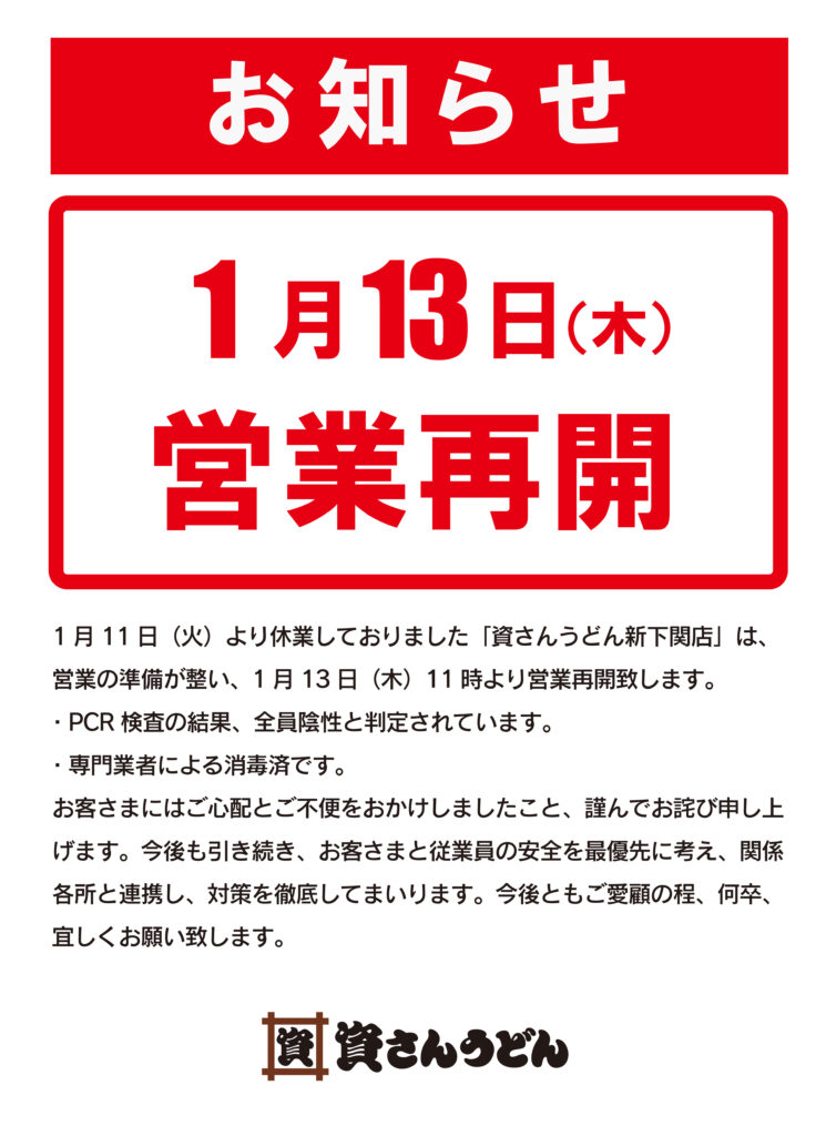 1/11(火)〜休業しておりました資さんうどん新下関店は、明日1/13(木)11:00〜営業を再開致します。