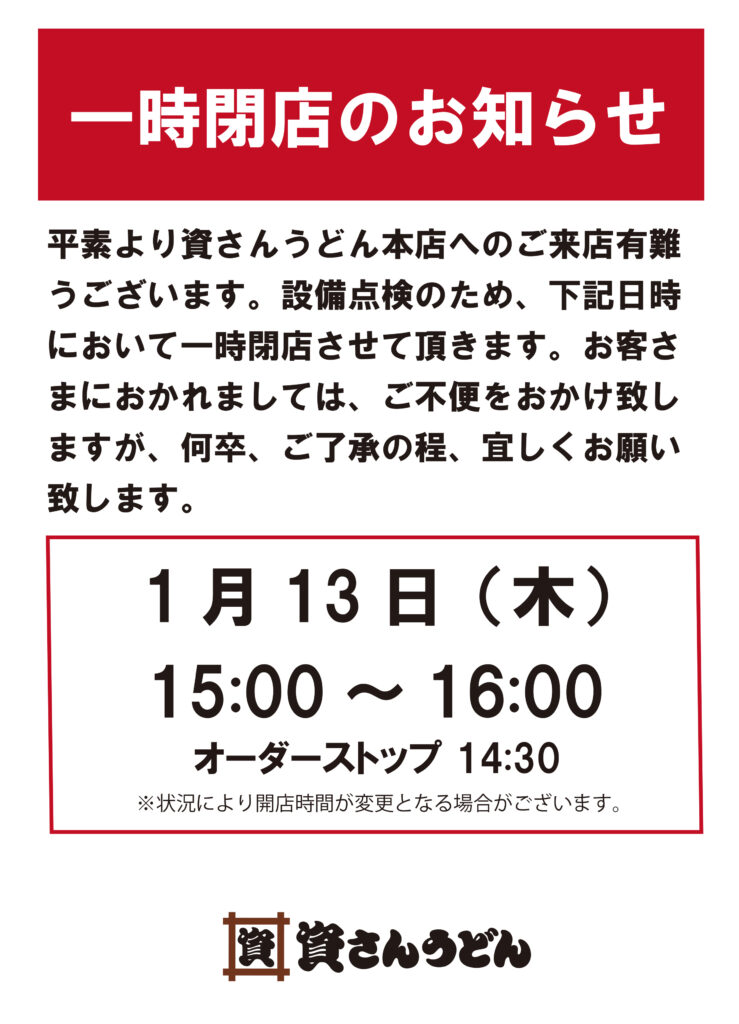 資さんうどん本店は、設備点検のため、1月13日(木)15時~16時の間、一時閉店させて頂きます。(オーダーストップ14:30)お客さまにおかれましては、ご不便・ご迷惑をおかけ致しますが、何卒、ご理解、ご了承の程、宜しくお願い致します。