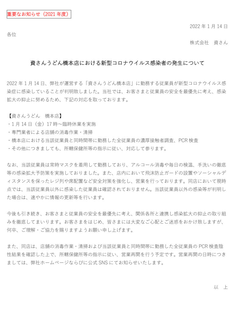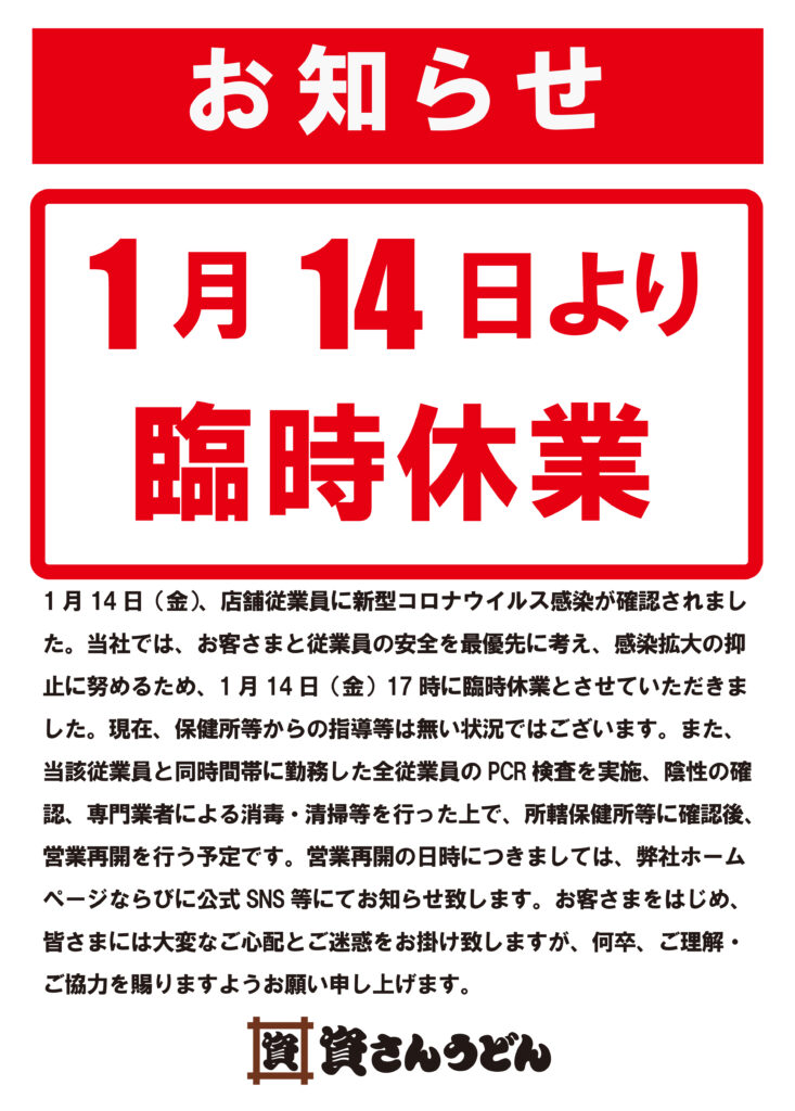 1月14日(金)、弊社が運営する資さんうどん橋本店の店舗従業員に新型コロナウイルス感染が確認されました。当社では、お客さまと従業員の安全を最優先に考え、感染拡大の抑止に努めるため、1 月14日(金)17時に臨時休業とさせていただきました。現在、保健所等からの指導等は無い状況ではございます。また、当該従業員と同時間帯に勤務した全従業員のPCR 検査を実施、陰性の確認、専門業者による消毒・清掃等を行った上で、所轄保健所等に確認後、営業再開を行う予定です。営業再開の日時につきましては、弊社ホームページならびに公式SNS 等にてお知らせ致します。お客さまをはじめ、皆さまには大変なご心配とご迷惑をお掛け致しますが、何卒、ご理解・ご協力を賜りますようお願い申し上げます。