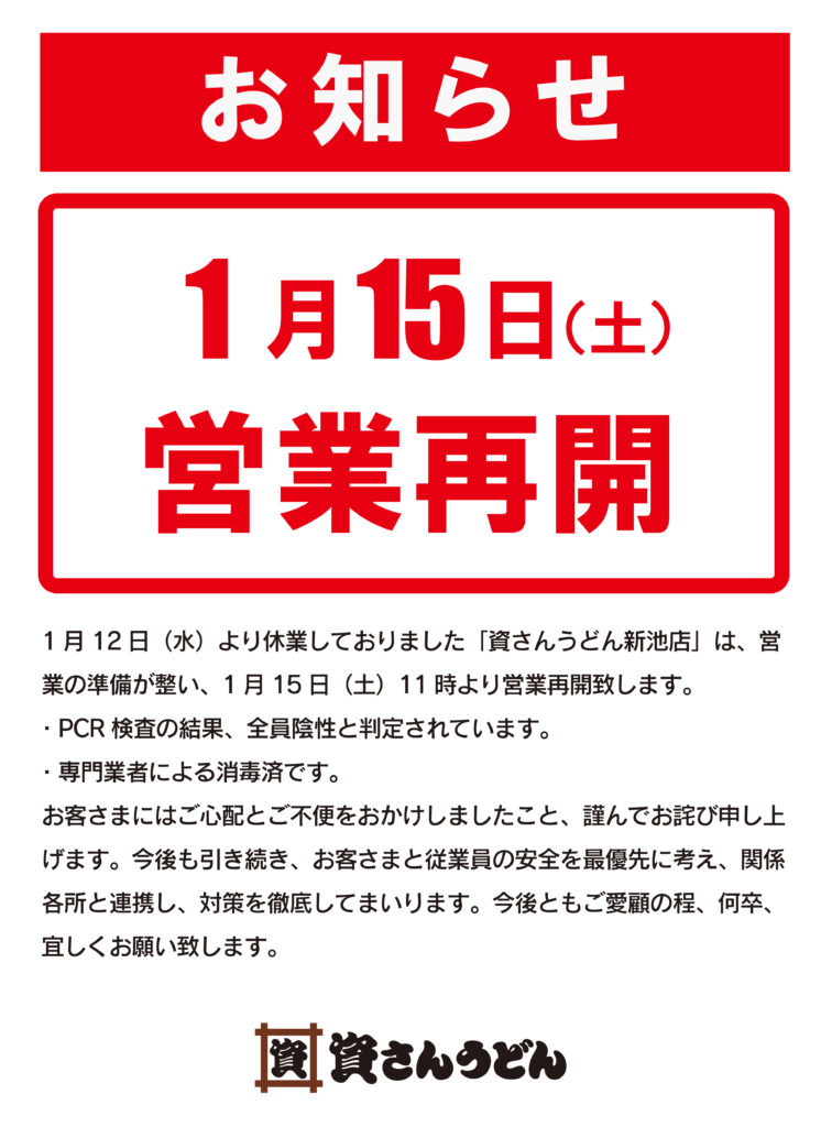 1/12(水)〜休業しておりました資さんうどん新池店は、本日1/15(土)11:00〜営業を再開致します。