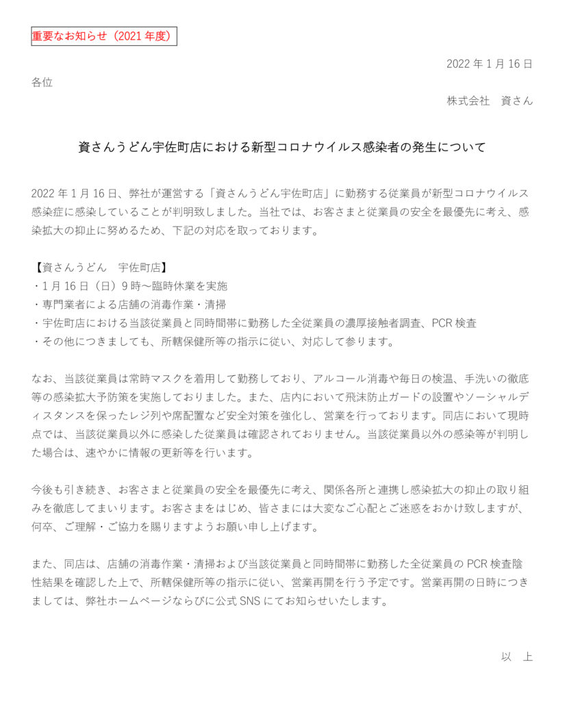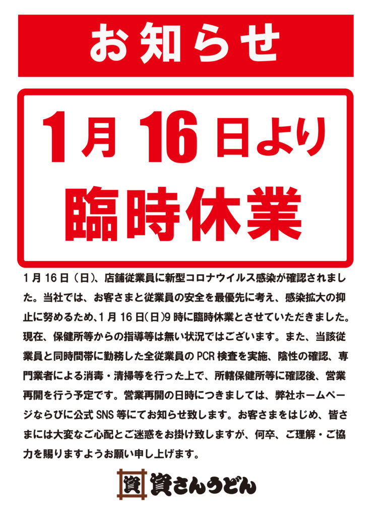 1月16日(日)、弊社が運営する資さんうどん宇佐町店の店舗従業員に新型コロナウイルス感染が確認されました。当社では、お客さまと従業員の安全を最優先に考え、感染拡大の抑止に努めるため、1 月16日(日)9時に臨時休業とさせていただきました。現在、保健所等からの指導等は無い状況ではございます。また、当該従業員と同時間帯に勤務した全従業員のPCR 検査を実施、陰性の確認、専門業者による消毒・清掃等を行った上で、所轄保健所等に確認後、営業再開を行う予定です。営業再開の日時につきましては、弊社ホームページならびに公式SNS 等にてお知らせ致します。お客さまをはじめ、皆さまには大変なご心配とご迷惑をお掛け致しますが、何卒、ご理解・ご協力を賜りますようお願い申し上げます。