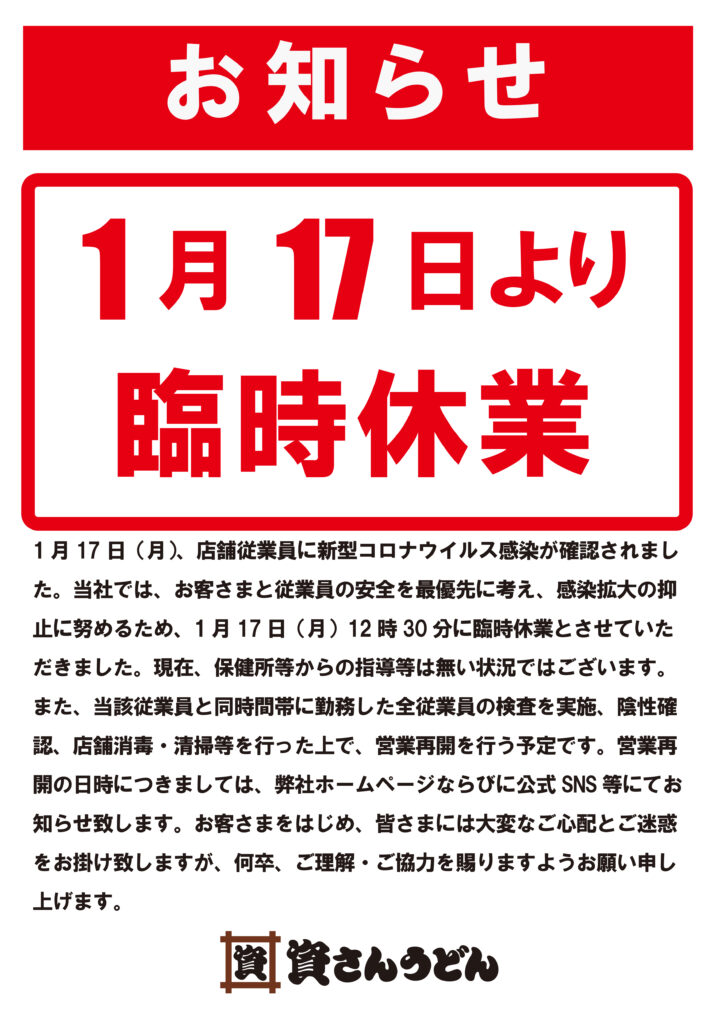 1月17日(月)、弊社が運営する資さんうどん志免町店の店舗従業員に新型コロナウイルス感染が確認されました。当社では、お客さまと従業員の安全を最優先に考え、感染拡大の抑止に努めるため、1 月17日(月)12時30分に臨時休業とさせていただきました。現在、保健所等からの指導等は無い状況ではございます。また、当該従業員と同時間帯に勤務した全従業員の検査実施、陰性の確認、店舗消毒・清掃等を行った上で、営業再開を行う予定です。営業再開の日時につきましては、弊社ホームページならびに公式SNS 等にてお知らせ致します。お客さまをはじめ、皆さまには大変なご心配とご迷惑をお掛け致しますが、何卒、ご理解・ご協力を賜りますようお願い申し上げます。