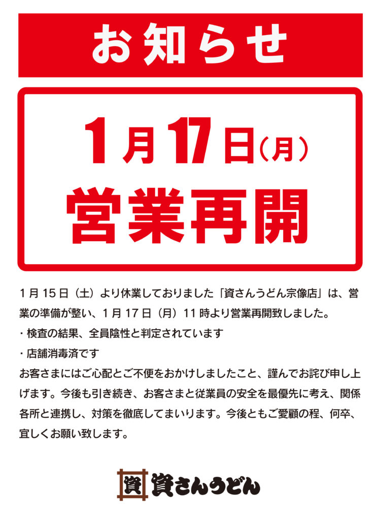 1/15(土)〜休業しておりました資さんうどん宗像店は、本日1/17(月)11:00〜営業を再開致しました。