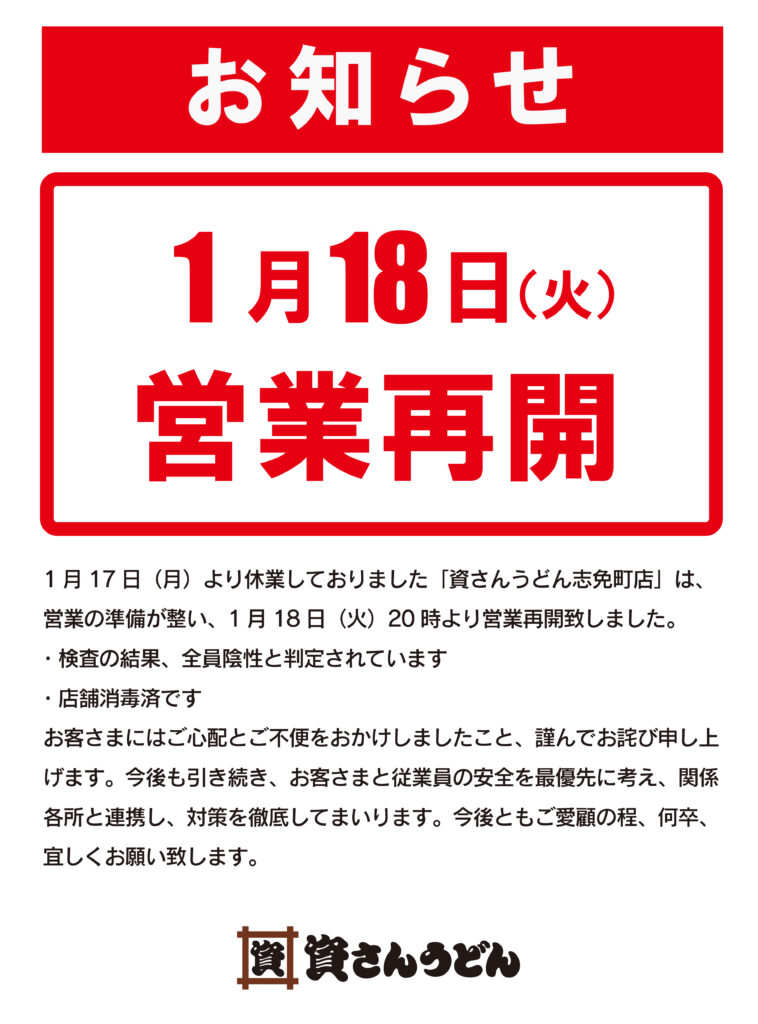 1/17(月)〜休業しておりました資さんうどん志免町店は、本日1/18(火)20:00〜営業を再開致しました。