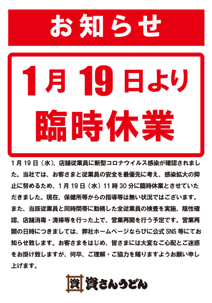 1月19日(水)、弊社が運営する資さんうどん陣山店の店舗従業員に新型コロナウイルス感染が確認されました。当社では、お客さまと従業員の安全を最優先に考え、感染拡大の抑止に努めるため、1 月19日(水)11時30分に臨時休業とさせていただきました。現在、保健所等からの指導等は無い状況ではございます。また、当該従業員と同時間帯に勤務した全従業員の検査実施、陰性の確認、店舗消毒・清掃等を行った上で、営業再開を行う予定です。営業再開の日時につきましては、弊社ホームページならびに公式SNS 等にてお知らせ致します。お客さまをはじめ、皆さまには大変なご心配とご迷惑をお掛け致しますが、何卒、ご理解・ご協力を賜りますようお願い申し上げます。