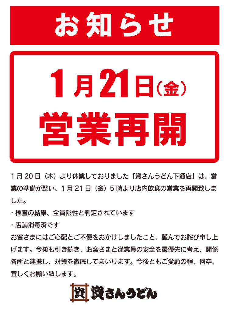 1/20(木)〜休業しておりました資さんうどん下通店は、本日1/21(金)5:00〜店内飲食の営業を再開致しました。