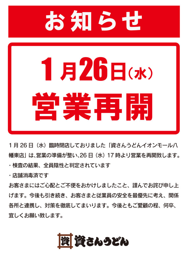 1/26(水)〜臨時閉店しておりました資さんうどんイオンモール八幡東店は、1/26(水)17時〜営業を再開致します。従業員の検査陰性確認、店舗消毒の完了を以って営業再開致します。