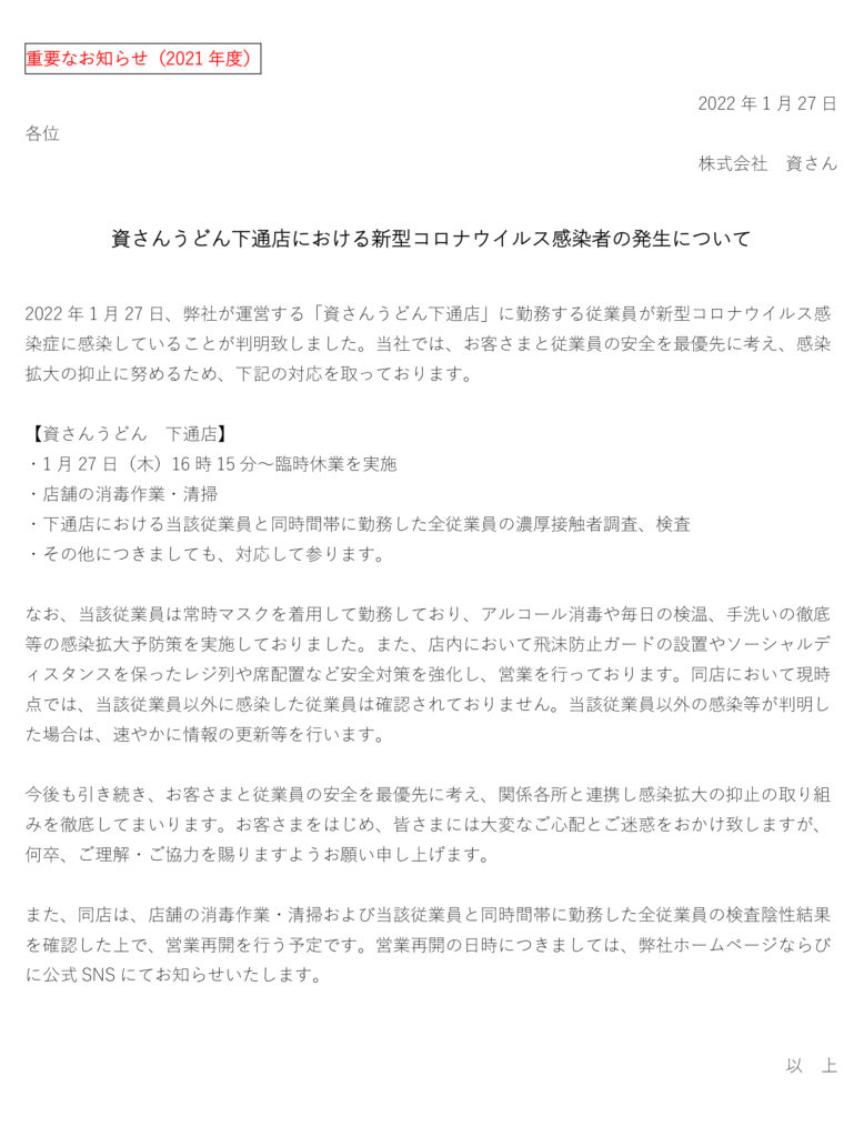 1月27日(木)、弊社が運営する資さんうどん下通店の店舗従業員に新型コロナウイルス感染が確認されました。当社では、お客さまと従業員の安全を最優先に考え、感染拡大の抑止に努めるため、1 月27日(木)16時15分に臨時休業とさせていただきました。現在、保健所等からの指導等は無い状況ではございます。また、当該従業員と同時間帯に勤務した全従業員の検査実施、陰性の確認、店舗消毒・清掃等を行った上で、営業再開を行う予定です。営業再開の日時につきましては、弊社ホームページならびに公式SNS 等にてお知らせ致します。お客さまをはじめ、皆さまには大変なご心配とご迷惑をお掛け致しますが、何卒、ご理解・ご協力を賜りますようお願い申し上げます。