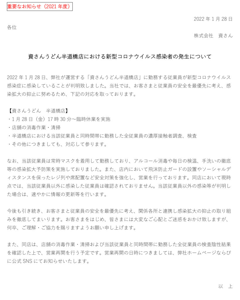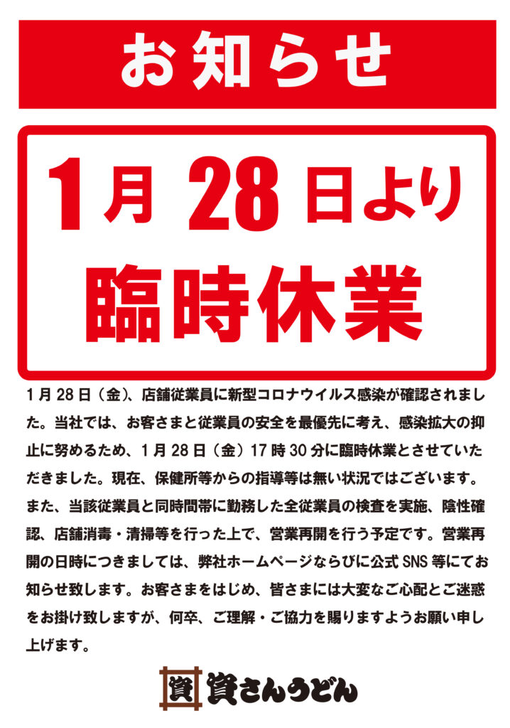 1月28日(金)、弊社が運営する資さんうどん半道橋店の店舗従業員に新型コロナウイルス感染が確認されました。当社では、お客さまと従業員の安全を最優先に考え、感染拡大の抑止に努めるため、1 月28日(金)17時30分に臨時休業とさせていただきました。現在、保健所等からの指導等は無い状況ではございます。また、当該従業員と同時間帯に勤務した全従業員の検査実施、陰性の確認、店舗消毒・清掃等を行った上で、営業再開を行う予定です。営業再開の日時につきましては、弊社ホームページならびに公式SNS 等にてお知らせ致します。お客さまをはじめ、皆さまには大変なご心配とご迷惑をお掛け致しますが、何卒、ご理解・ご協力を賜りますようお願い申し上げます。