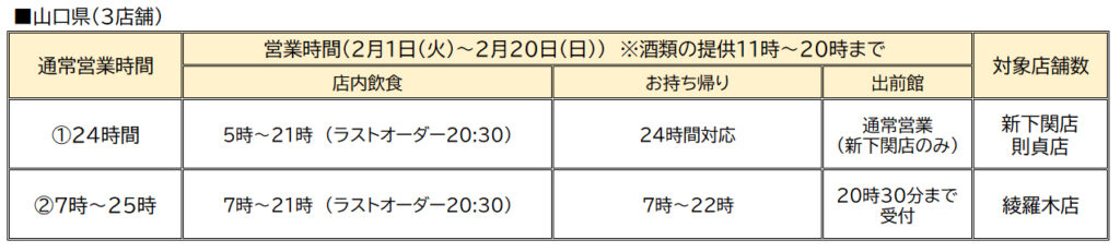 山口県からの飲食店に対する時短営業要請を受け、2/1(火)~2/20(日)の期間、山口県下3店舗の営業時間を下記の通りとさせていただきます。なお、1(火)0時~の要請のため、1/31(月)の店内飲食時間は24時まで(23:30オーダーストップ)となります。お客さまにおかれましては、ご不便・ご迷惑をおかけしますが、何卒、ご理解・ご承知の程、宜しくお願い致します。