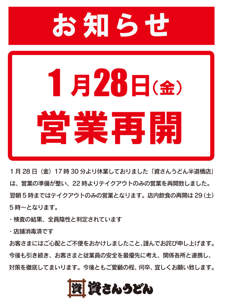 1/28(金)〜休業しておりました資さんうどん半道橋店は、1/28(金)22時〜テイクアウト営業を再開致しました。店内飲食の再開は、29日(土)朝5時~となります。