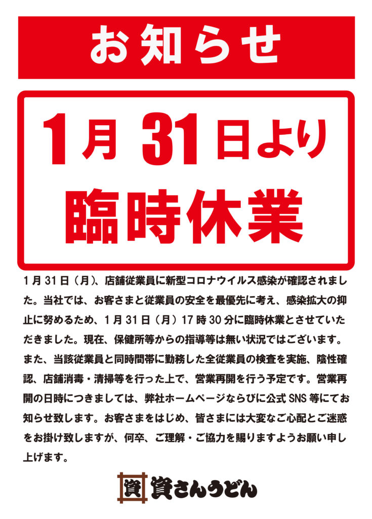 1月31日(月)、弊社が運営する資さんうどん永犬丸店の店舗従業員に新型コロナウイルス感染が確認されました。当社では、お客さまと従業員の安全を最優先に考え、感染拡大の抑止に努めるため、1 月31日(月)17時30分に臨時休業とさせていただきました。現在、保健所等からの指導等は無い状況ではございます。また、当該従業員と同時間帯に勤務した全従業員の検査実施、陰性の確認、店舗消毒・清掃等を行った上で、営業再開を行う予定です。営業再開の日時につきましては、弊社ホームページならびに公式SNS 等にてお知らせ致します。お客さまをはじめ、皆さまには大変なご心配とご迷惑をお掛け致しますが、何卒、ご理解・ご協力を賜りますようお願い申し上げます。