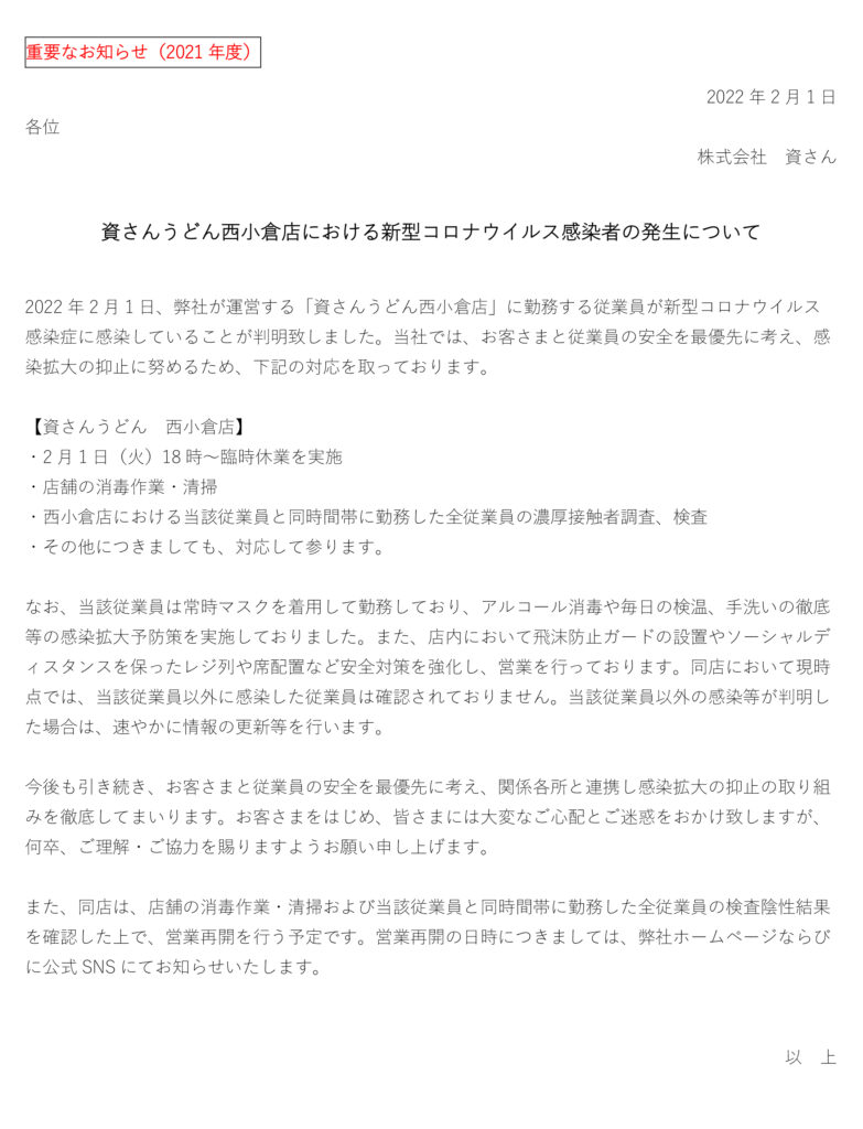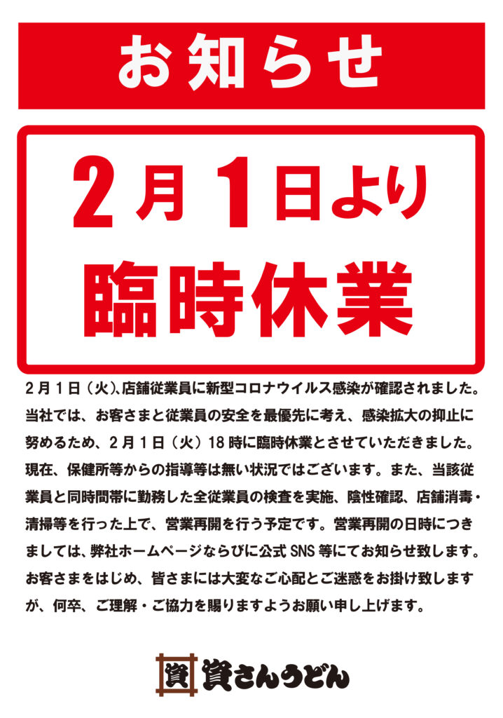 2月1日(火)、弊社が運営する資さんうどん西小倉店の店舗従業員に新型コロナウイルス感染が確認されました。当社では、お客さまと従業員の安全を最優先に考え、感染拡大の抑止に努めるため、2月1日(火)17時30分に臨時休業とさせていただきました。現在、保健所等からの指導等は無い状況ではございます。また、当該従業員と同時間帯に勤務した全従業員の検査実施、陰性の確認、店舗消毒・清掃等を行った上で、営業再開を行う予定です。営業再開の日時につきましては、弊社ホームページならびに公式SNS 等にてお知らせ致します。お客さまをはじめ、皆さまには大変なご心配とご迷惑をお掛け致しますが、何卒、ご理解・ご協力を賜りますようお願い申し上げます。