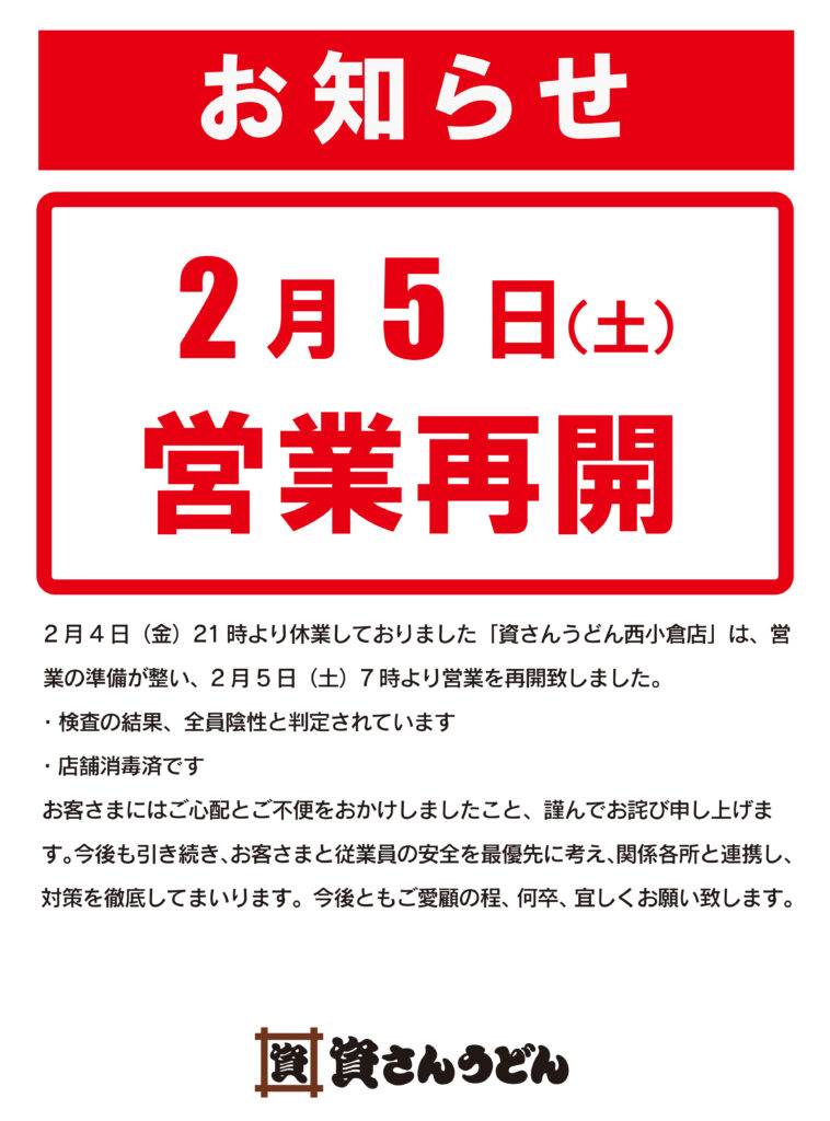 2/4(金)〜休業しておりました資さんうどん西小倉店は、2/5(土)7時〜営業を再開致しました。