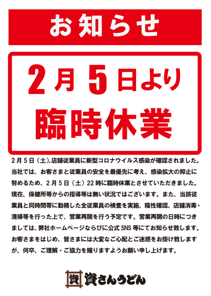 2月5日(土)、弊社が運営する資さんうどん苅田店の店舗従業員に新型コロナウイルス感染が確認されました。当社では、お客さまと従業員の安全を最優先に考え、感染拡大の抑止に努めるため、2月5日(土)22時に臨時休業とさせていただきました。現在、保健所等からの指導等は無い状況ではございます。また、当該従業員と同時間帯に勤務した全従業員の検査実施、陰性の確認、店舗消毒・清掃等を行った上で、営業再開を行う予定です。営業再開の日時につきましては、弊社ホームページならびに公式SNS 等にてお知らせ致します。お客さまをはじめ、皆さまには大変なご心配とご迷惑をお掛け致しますが、何卒、ご理解・ご協力を賜りますようお願い申し上げます。