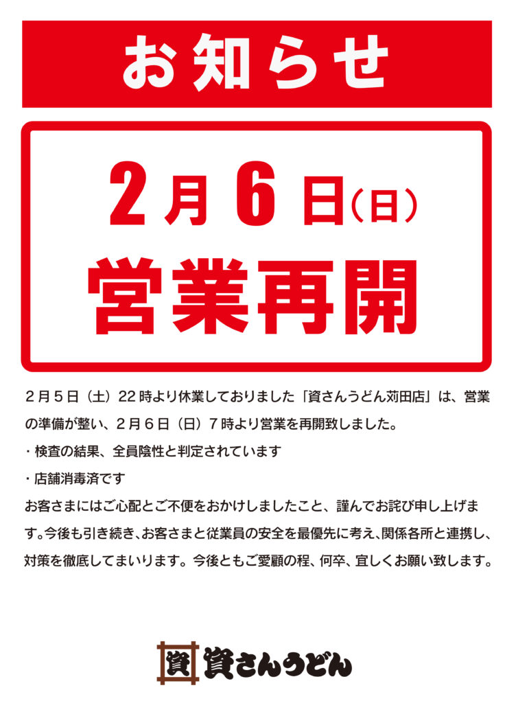 2/5(土)〜休業しておりました資さんうどん苅田店は、2/6(日)7時〜営業を再開致しました。