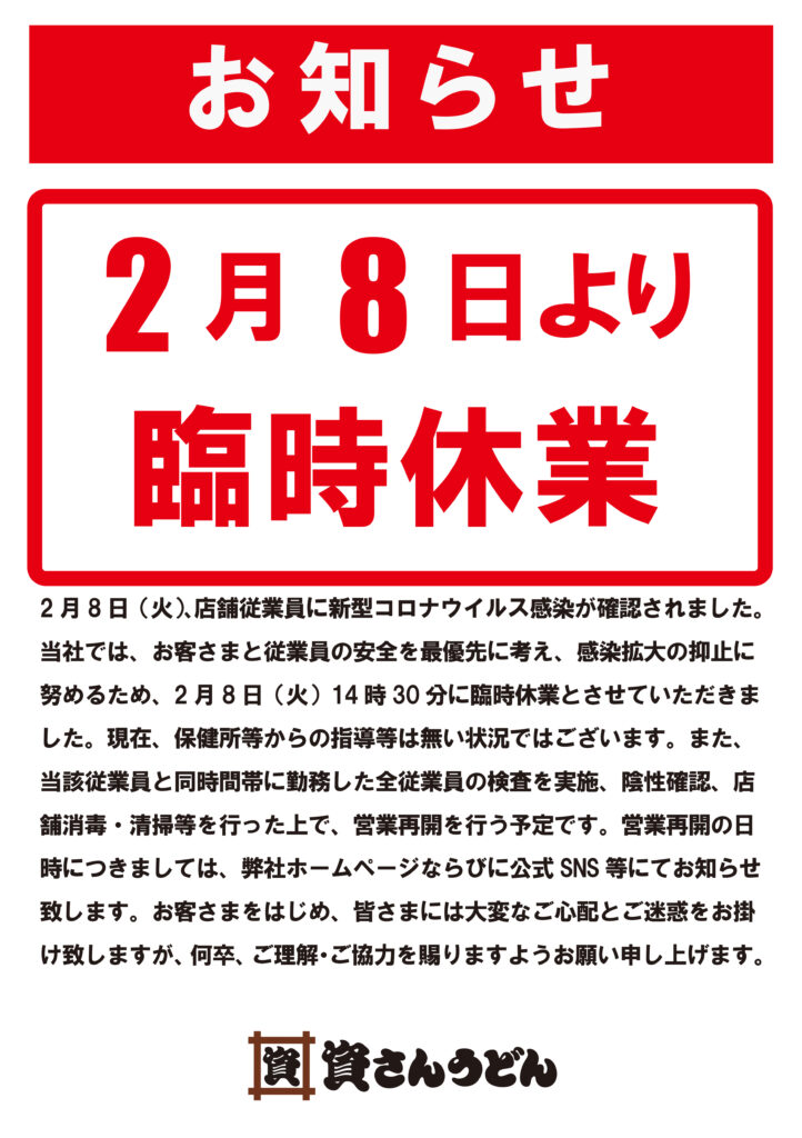 2月8日(火)、弊社が運営する資さんうどん徳吉店の店舗従業員に新型コロナウイルス感染が確認されました。当社では、お客さまと従業員の安全を最優先に考え、感染拡大の抑止に努めるため、2月8日(火)14時30分に臨時休業とさせていただきました。現在、保健所等からの指導等は無い状況ではございます。また、当該従業員と同時間帯に勤務した全従業員の検査実施、陰性の確認、店舗消毒・清掃等を行った上で、営業再開を行う予定です。営業再開の日時につきましては、弊社ホームページならびに公式SNS 等にてお知らせ致します。お客さまをはじめ、皆さまには大変なご心配とご迷惑をお掛け致しますが、何卒、ご理解・ご協力を賜りますようお願い申し上げます。