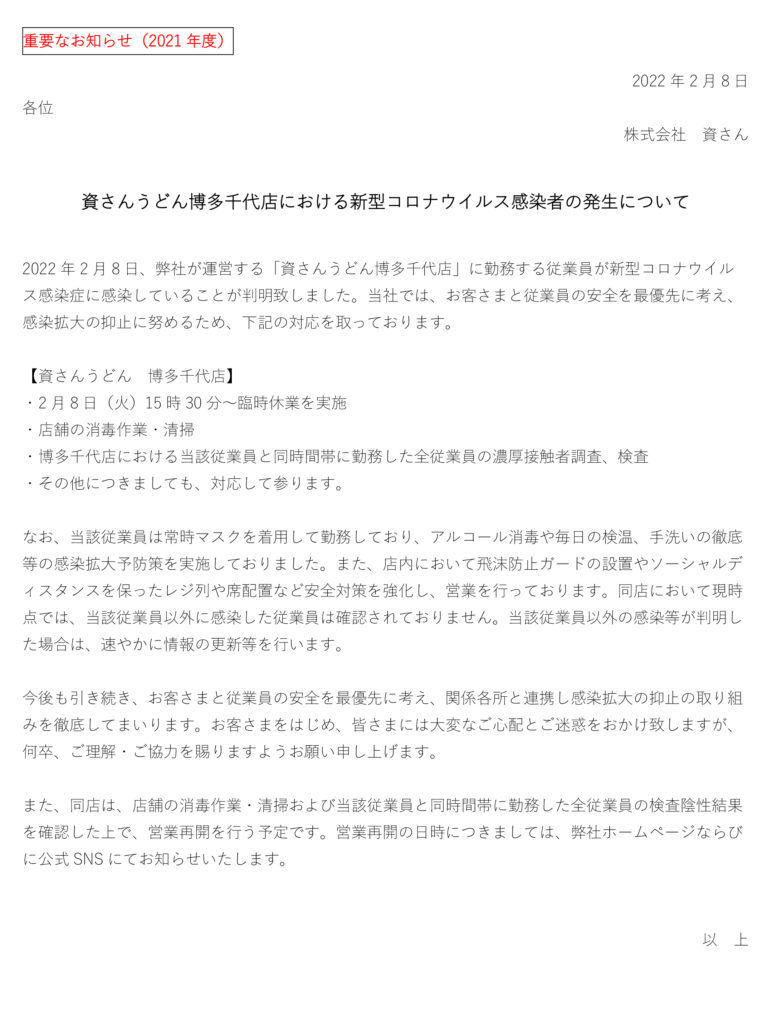 【重要なお知らせ】2/8(火)~資さんうどん博多千代店臨時休業のお知らせ