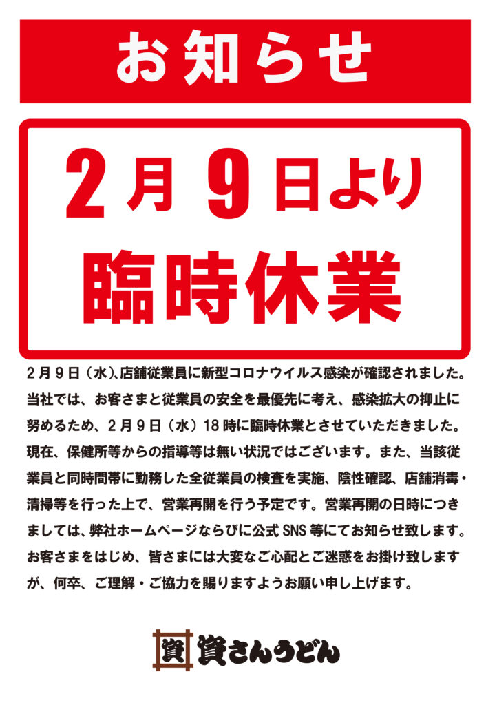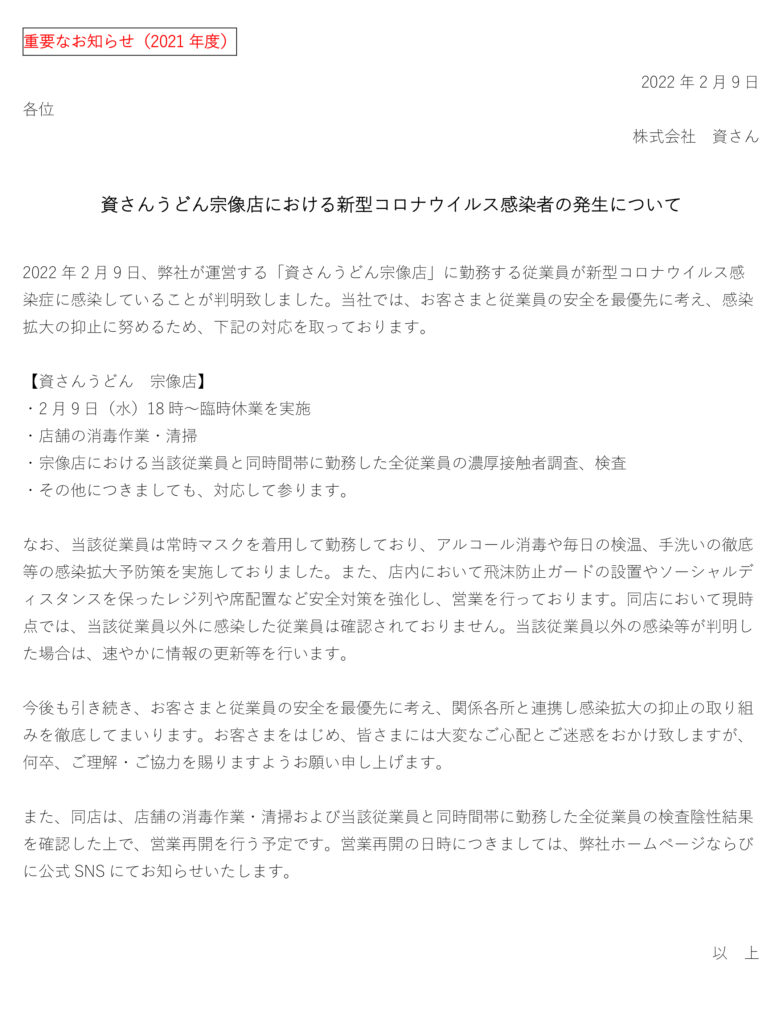 2月9日(水)、弊社が運営する資さんうどん宗像店の店舗従業員に新型コロナウイルス感染が確認されました。当社では、お客さまと従業員の安全を最優先に考え、感染拡大の抑止に努めるため、2月9日(水)18時に臨時休業とさせていただきました。現在、保健所等からの指導等は無い状況ではございます。また、当該従業員と同時間帯に勤務した全従業員の検査実施、陰性の確認、店舗消毒・清掃等を行った上で、営業再開を行う予定です。営業再開の日時につきましては、弊社ホームページならびに公式SNS 等にてお知らせ致します。お客さまをはじめ、皆さまには大変なご心配とご迷惑をお掛け致しますが、何卒、ご理解・ご協力を賜りますようお願い申し上げます。