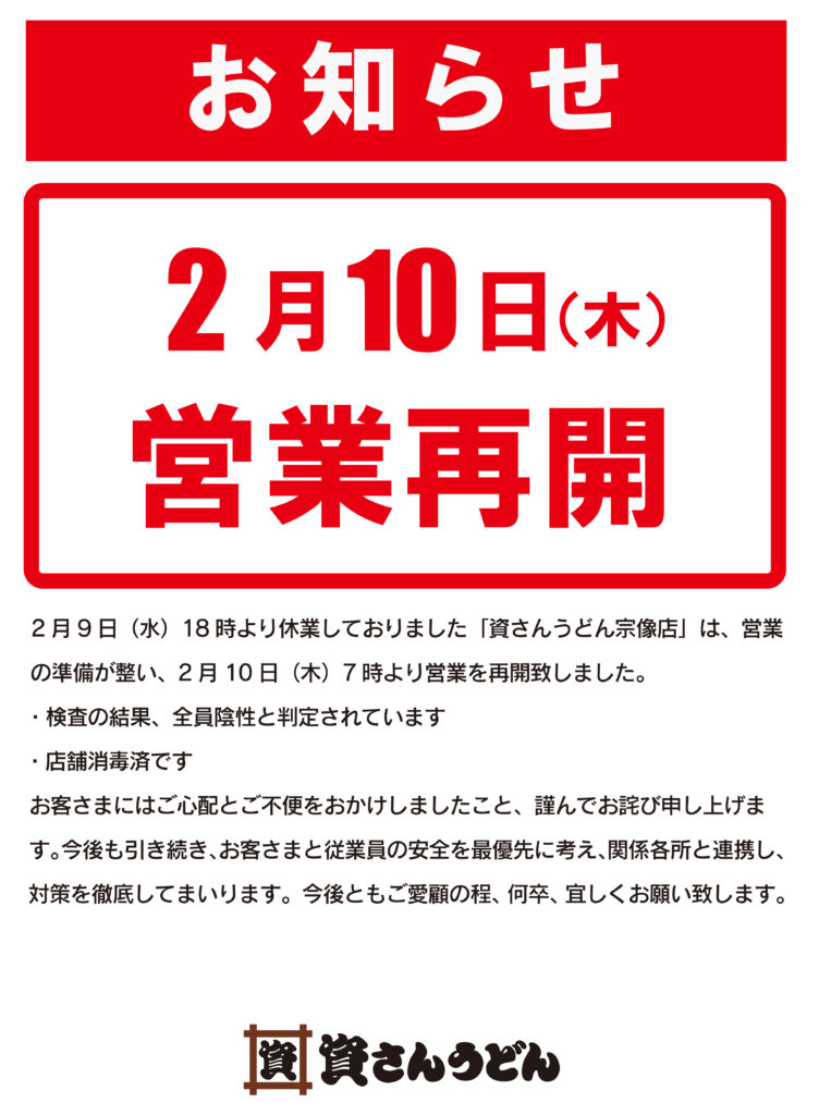 2/9(水)18時〜休業しておりました資さんうどん宗像店は、2/10(木)7時〜営業を再開致しました。