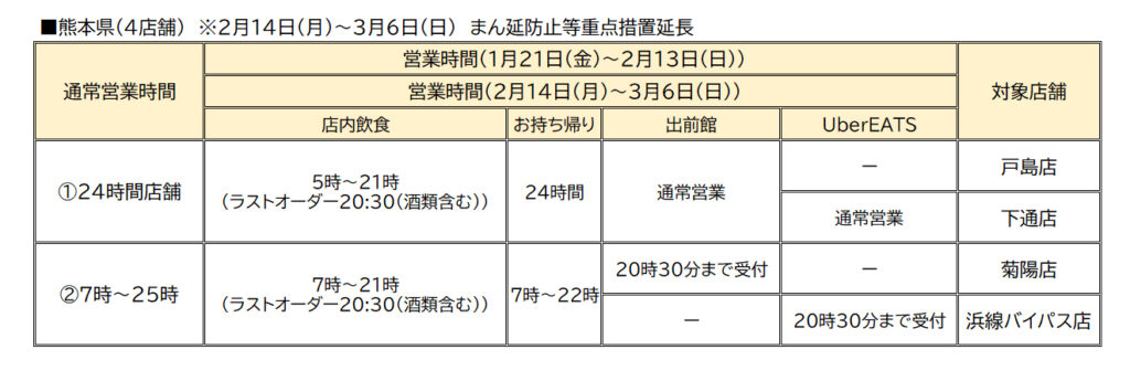 2/14(月)~3/6(日)熊本県下4店舗営業時間変更について