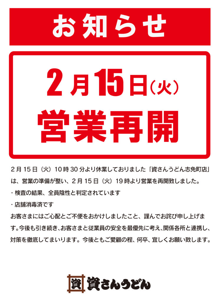 2/15(火)10時30分〜休業しておりました資さんうどん志免町店は、2/15(火)19時〜営業を再開致しました。