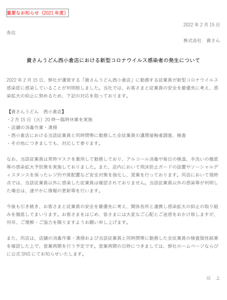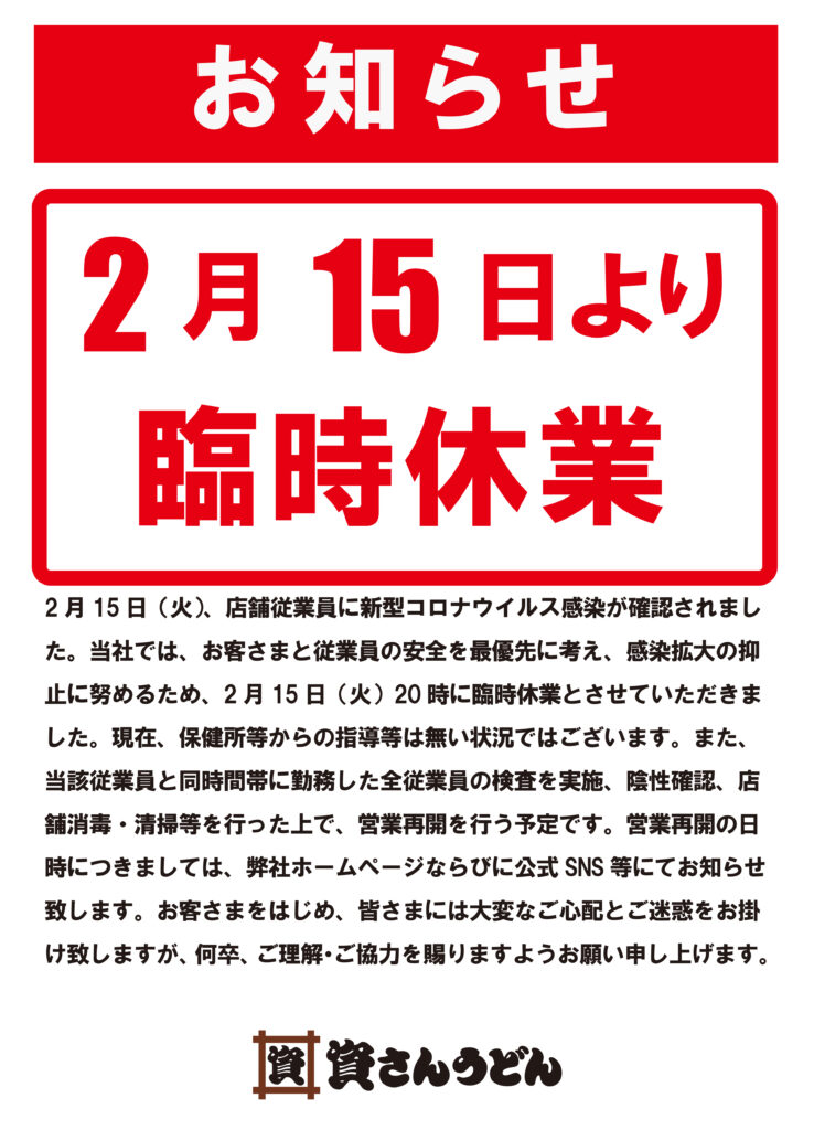 2月15日(火)、弊社が運営する資さんうどん西小倉店の店舗従業員に新型コロナウイルス感染が確認されました。当社では、お客さまと従業員の安全を最優先に考え、感染拡大の抑止に努めるため、2月15日(火)20時に臨時休業とさせていただきました。現在、保健所等からの指導等は無い状況ではございます。また、当該従業員と同時間帯に勤務した全従業員の検査実施、陰性の確認、店舗消毒・清掃等を行った上で、営業再開を行う予定です。営業再開の日時につきましては、弊社ホームページならびに公式SNS 等にてお知らせ致します。お客さまをはじめ、皆さまには大変なご心配とご迷惑をお掛け致しますが、何卒、ご理解・ご協力を賜りますようお願い申し上げます。