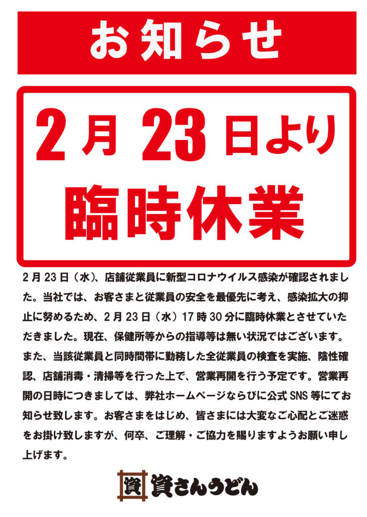 2月23日(水)、弊社が運営する資さんうどん行橋店の店舗従業員に新型コロナウイルス感染が確認されました。当社では、お客さまと従業員の安全を最優先に考え、感染拡大の抑止に努めるため、2月23日(水)17時30分に臨時休業とさせていただきました。現在、保健所等からの指導等は無い状況ではございます。また、当該従業員と同時間帯に勤務した全従業員の検査実施、陰性の確認、店舗消毒・清掃等を行った上で、営業再開を行う予定です。営業再開の日時につきましては、弊社ホームページならびに公式SNS 等にてお知らせ致します。お客さまをはじめ、皆さまには大変なご心配とご迷惑をお掛け致しますが、何卒、ご理解・ご協力を賜りますようお願い申し上げます。
