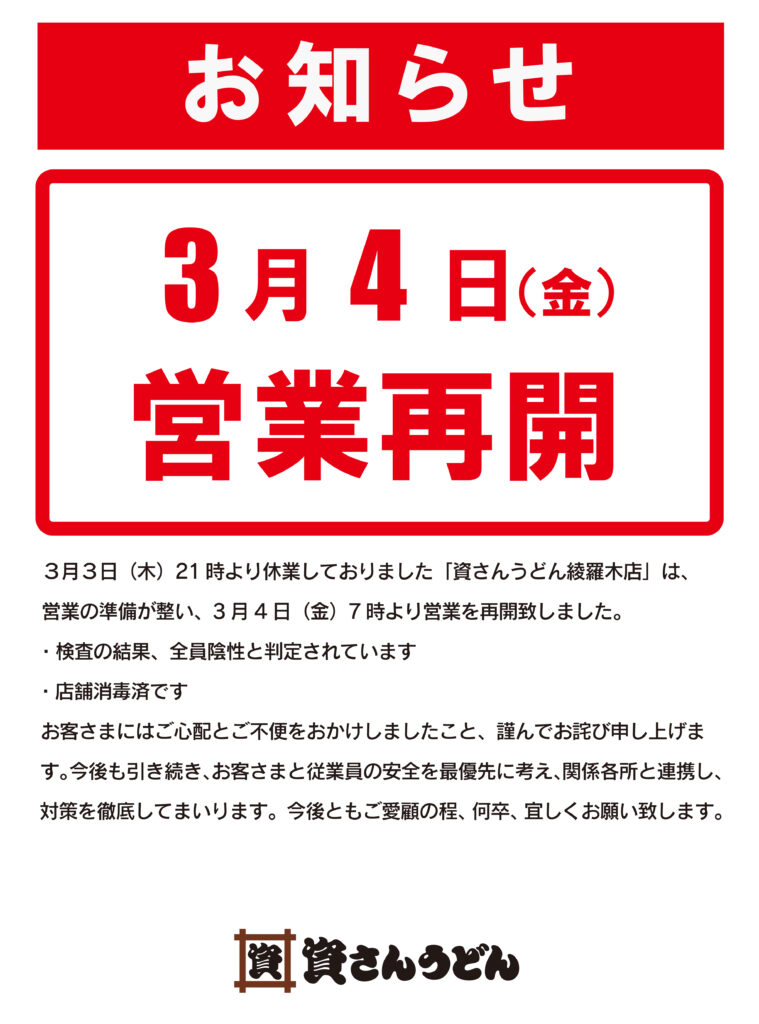 3/3(木)21時〜休業しておりました資さんうどん綾羅木店は、3/4(金)7時〜営業を再開致しました。従業員の検査陰性確認、店舗消毒の完了を以って営業再開致しました。