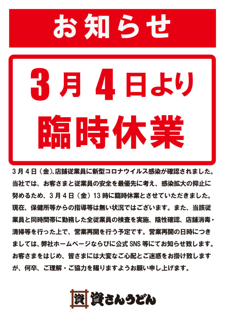 3月4日(金)、弊社が運営する資さんうどん町上津役店の店舗従業員に新型コロナウイルス感染が確認されました。当社では、お客さまと従業員の安全を最優先に考え、感染拡大の抑止に努めるため、3月4日(金)13時に臨時休業とさせていただきました。現在、保健所等からの指導等は無い状況ではございます。また、当該従業員と同時間帯に勤務した全従業員の検査実施、陰性の確認、店舗消毒・清掃等を行った上で、営業再開を行う予定です。営業再開の日時につきましては、弊社ホームページならびに公式SNS 等にてお知らせ致します。お客さまをはじめ、皆さまには大変なご心配とご迷惑をお掛け致しますが、何卒、ご理解・ご協力を賜りますようお願い申し上げます。