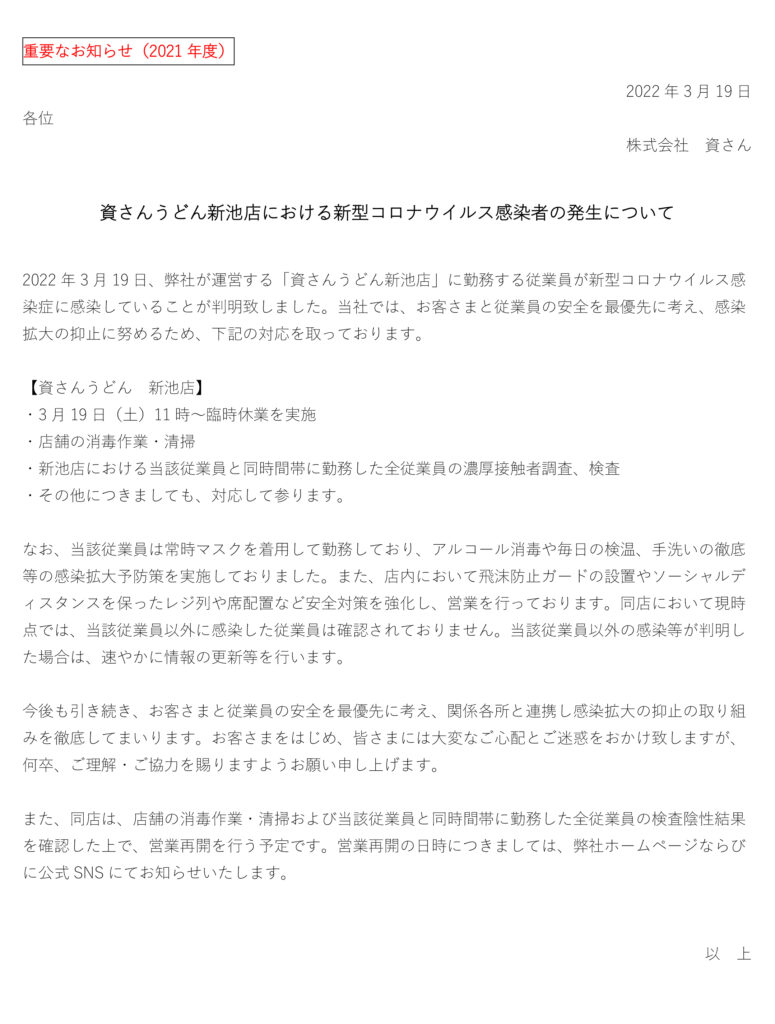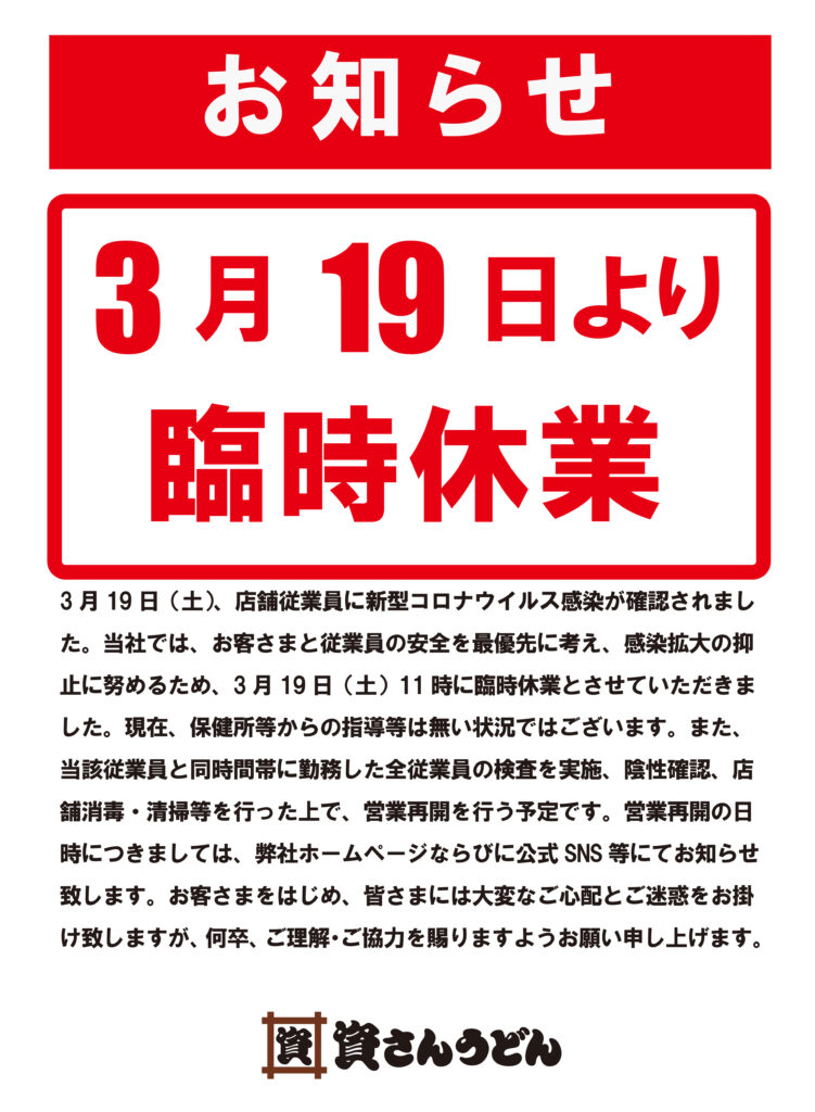 3月19日(土)、弊社が運営する資さんうどん新池店の店舗従業員に新型コロナウイルス感染が確認されました。当社では、お客さまと従業員の安全を最優先に考え、感染拡大の抑止に努めるため、3月19日(土)11時に臨時休業とさせていただきました。現在、保健所等からの指導等は無い状況ではございます。また、当該従業員と同時間帯に勤務した全従業員の検査実施、陰性の確認、店舗消毒・清掃等を行った上で、営業再開を行う予定です。営業再開の日時につきましては、弊社ホームページならびに公式SNS 等にてお知らせ致します。お客さまをはじめ、皆さまには大変なご心配とご迷惑をお掛け致しますが、何卒、ご理解・ご協力を賜りますようお願い申し上げます。