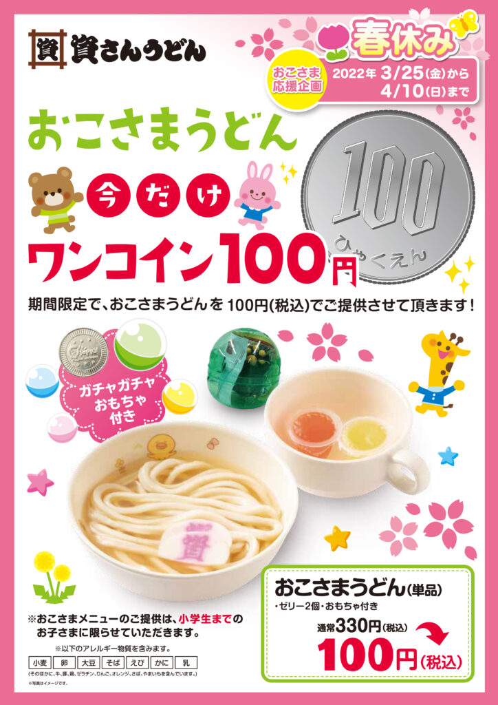 資さんうどんでは、春休みのおこさま企画として、3/25(金)~4/10(日)の期間、小学生以下のお子さま限定で、「おこさまうどん」(通常330円)を100円(税込)にてご提供します。ガチャガチャコインとゼリー付きです。春休みのお食事は資さんうどんでご家族そろってお楽しみください!