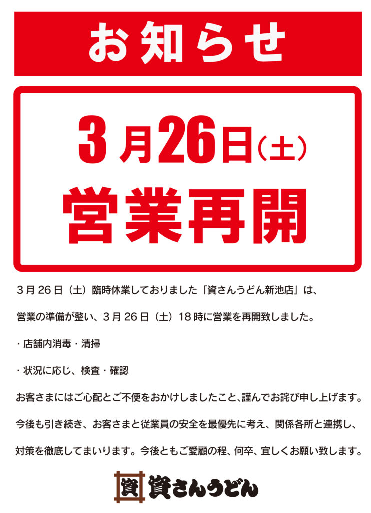 3/26(土)臨時休業しておりました資さんうどん新池店は、3/26(土)18時〜営業を再開致しました。店舗消毒・清掃および状況に応じ、検査・確認の完了を以って営業再開致しました。