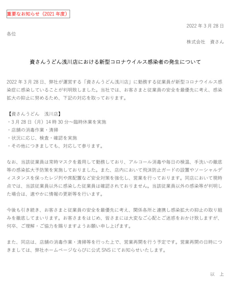 3月28日(月)、弊社が運営する資さんうどん浅川店の店舗従業員に新型コロナウイルス感染が確認されました。当社では、お客さまと従業員の安全を最優先に考え、感染拡大の抑止に努めるため、3月28日(月)14時30分に臨時休業とさせていただきました。現在、保健所等からの指導等は無い状況ではございます。また、店舗消毒・清掃等ならびに状況に応じ、検査・確認を行った上で、営業再開を行う予定です。営業再開の日時につきましては、弊社ホームページならびに公式SNS 等にてお知らせ致します。お客さまをはじめ、皆さまには大変なご心配とご迷惑をお掛け致しますが、何卒、ご理解・ご協力を賜りますようお願い申し上げます。
