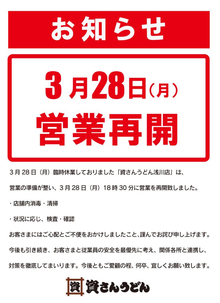 3/28(月)臨時休業しておりました資さんうどん浅川店は、3/28(月)18時30分〜営業を再開致しました。店舗消毒・清掃および状況に応じ、検査・確認の完了を以って営業再開致しました。