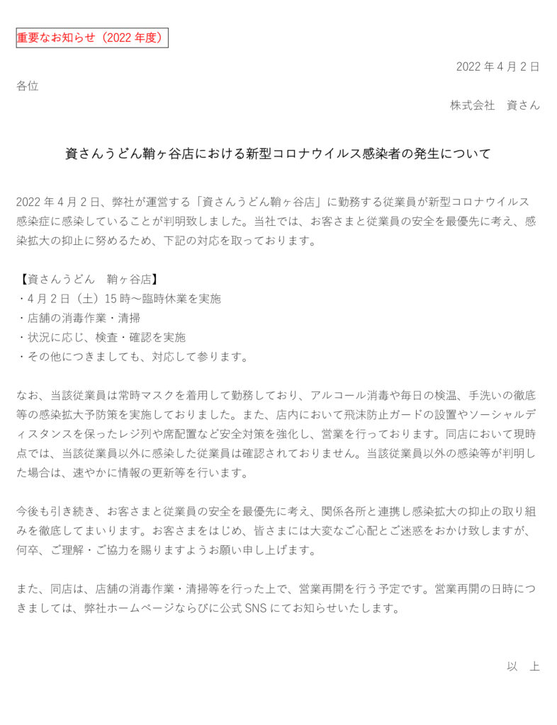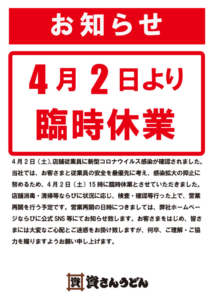 4月2日(土)、弊社が運営する資さんうどん鞘ヶ谷店の店舗従業員に新型コロナウイルス感染が確認されました。当社では、お客さまと従業員の安全を最優先に考え、感染拡大の抑止に努めるため、4月2日(土)15時に臨時休業とさせていただきました。現在、保健所等からの指導等は無い状況ではございます。また、店舗消毒・清掃等ならびに状況に応じ、検査・確認を行った上で、営業再開を行う予定です。営業再開の日時につきましては、弊社ホームページならびに公式SNS 等にてお知らせ致します。お客さまをはじめ、皆さまには大変なご心配とご迷惑をお掛け致しますが、何卒、ご理解・ご協力を賜りますようお願い申し上げます。