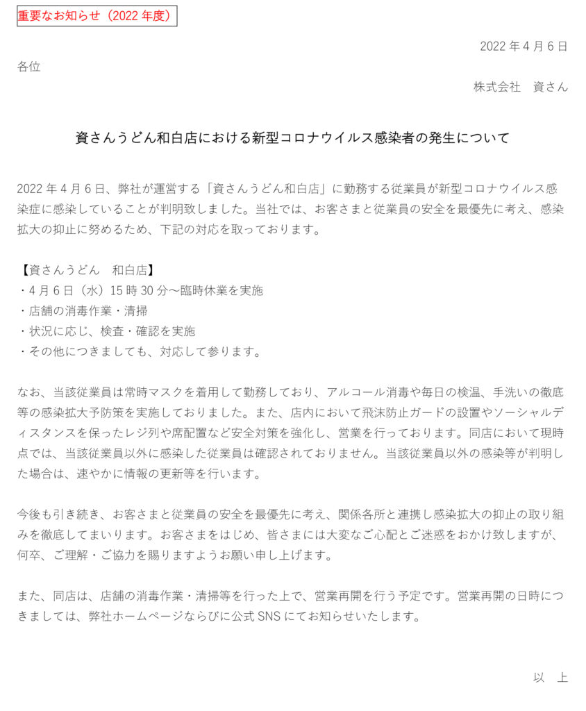 4月6日(水)、弊社が運営する資さんうどん和白店の店舗従業員に新型コロナウイルス感染が確認されました。当社では、お客さまと従業員の安全を最優先に考え、感染拡大の抑止に努めるため、4月6日(水)15時30分に臨時休業とさせていただきました。現在、保健所等からの指導等は無い状況ではございます。また、店舗消毒・清掃等ならびに状況に応じ、検査・確認を行った上で、営業再開を行う予定です。営業再開の日時につきましては、弊社ホームページならびに公式SNS 等にてお知らせ致します。お客さまをはじめ、皆さまには大変なご心配とご迷惑をお掛け致しますが、何卒、ご理解・ご協力を賜りますようお願い申し上げます。