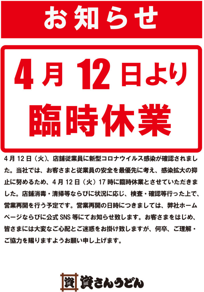 4月12日(火)、弊社が運営する資さんうどん中間店の店舗従業員に新型コロナウイルス感染が確認されました。当社では、お客さまと従業員の安全を最優先に考え、感染拡大の抑止に努めるため、4月12日(火)17時に臨時休業とさせていただきました。現在、保健所等からの指導等は無い状況ではございます。また、店舗消毒・清掃等ならびに状況に応じ、検査・確認を行った上で、営業再開を行う予定です。営業再開の日時につきましては、弊社ホームページならびに公式SNS 等にてお知らせ致します。お客さまをはじめ、皆さまには大変なご心配とご迷惑をお掛け致しますが、何卒、ご理解・ご協力を賜りますようお願い申し上げます。
