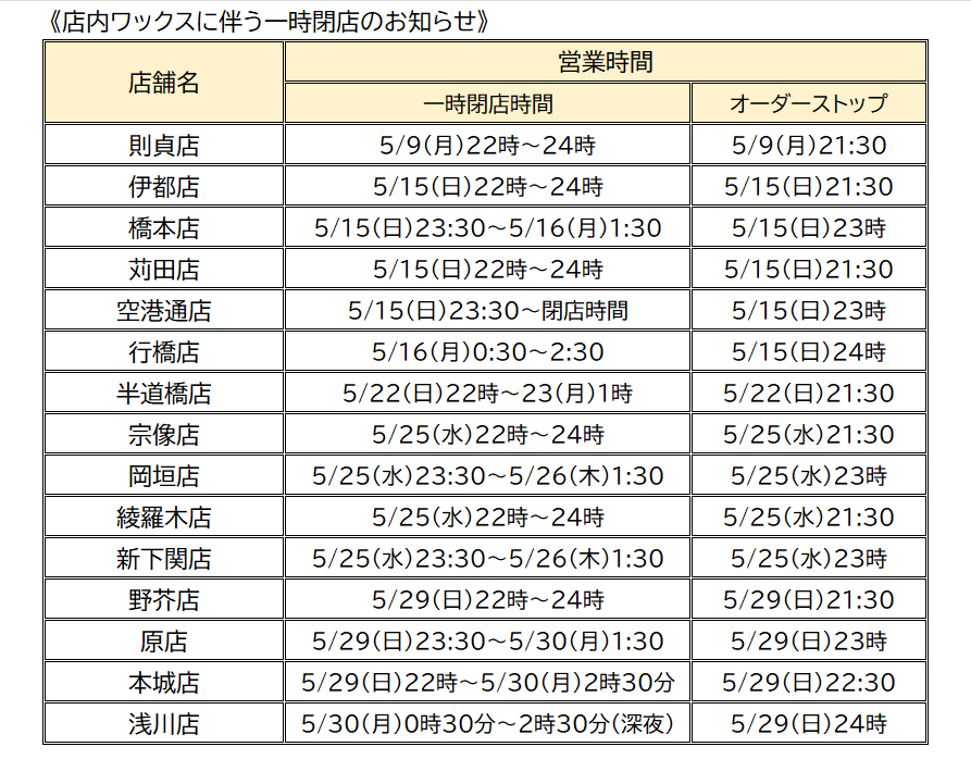 平素より資さんうどん各店をご愛顧いただき、誠にありがとうございます。ワックス清掃実施のため、勝手ながら、下記店舗において一時閉店とさせていただきます。皆様におかれましては、ご迷惑・ご不便をおかけしますが、何卒、ご理解・ご了承のほど、宜しくお願い致します。