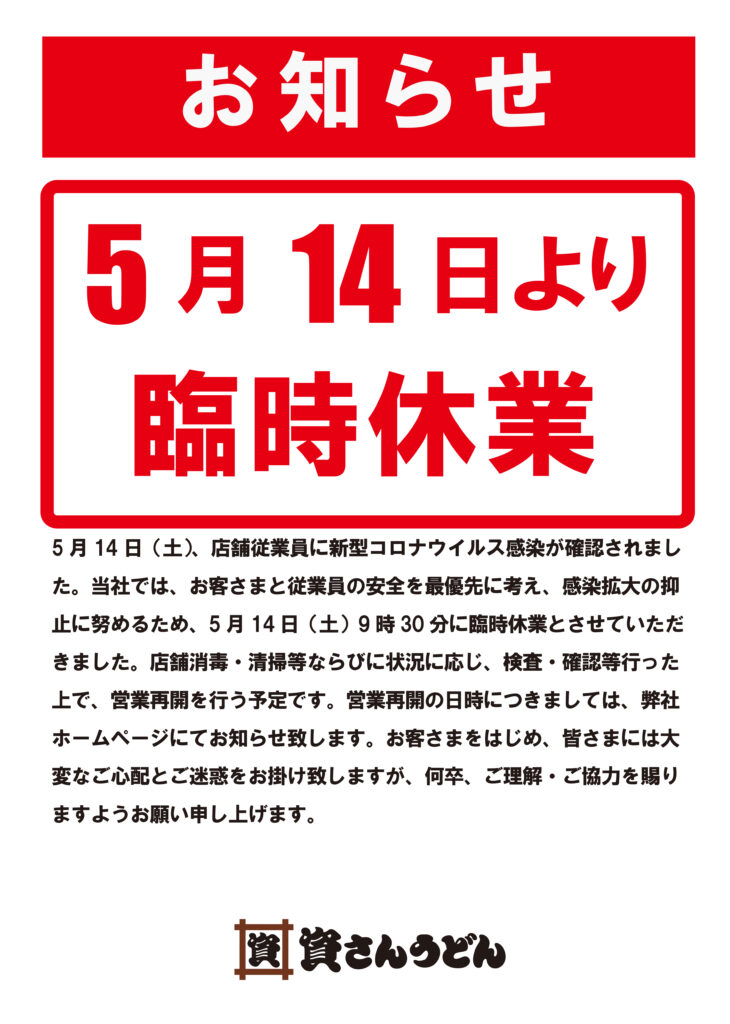 5月14日(土)、弊社が運営する資さんうどん徳吉店の店舗従業員に新型コロナウイルス感染が確認されました。当社では、お客さまと従業員の安全を最優先に考え、感染拡大の抑止に努めるため、5月14日(土)9時30分に臨時休業とさせていただきました。現在、保健所等からの指導等は無い状況ではございます。また、店舗消毒・清掃等ならびに状況に応じ、検査・確認を行った上で、営業再開を行う予定です。営業再開の日時につきましては、弊社ホームページにてお知らせ致します。お客さまをはじめ、皆さまには大変なご心配とご迷惑をお掛け致しますが、何卒、ご理解・ご協力を賜りますようお願い申し上げます。
